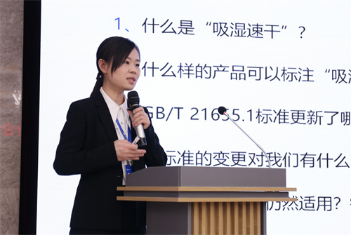 太阳成集团tyc检测事业部技术主管、高级工程师、资深培训师郑园园对吸湿速干类纺织品相关标准进行了解析。她阐述了吸湿速干的原理及检测方法以及该项目在GB/T 21655.1标准修订后的主要变更内容,在如何改善产品的吸湿速干性能方面给出了专业建议,并重点强调了功能性产品标识的注意事项。
