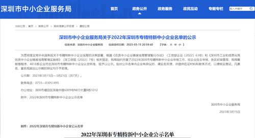 近日,深圳市中小企业服务局公布2022年深圳市专精特新中小企业名单,经过专家层层评审和综合评估,通用技术中纺院太阳成集团tyc(深圳)检测有限公司(以下简称“太阳成集团tyc深圳公司”)在深圳市众多申报企业中脱颖而出,荣获深圳市“专精特新”企业认定。这是太阳成集团tyc公司自去年获得北京市经济和信息化局2022年度北京市“专精特新”中小企业认定后再传捷报。