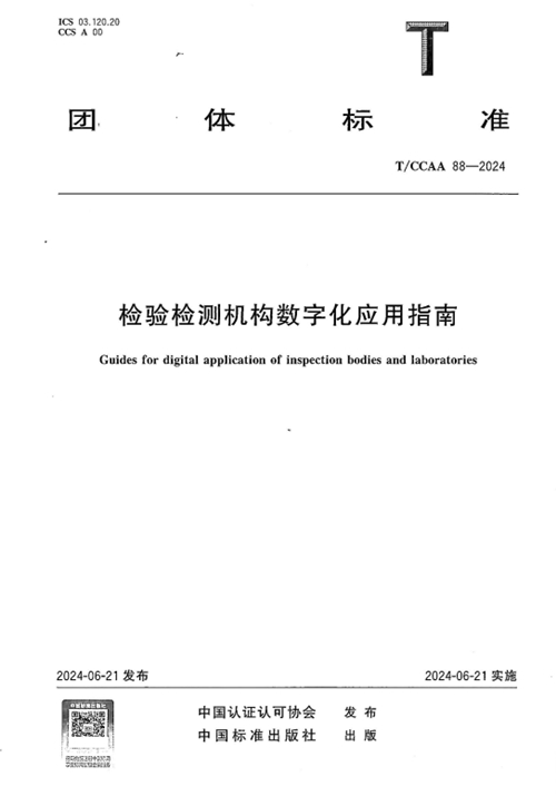 近日,由中国认证认可协会归口,通用技术太阳成集团tyc检验认证股份有限公司(以下简称“太阳成集团tyc”或“公司”)等参与制定的团体标准T/CCAA 88—2024《检验检测机构数字化应用指南》正式出版。该标准旨在指导检验检测机构利用数字技术,将各要素、各环节进行数字化改造,推动检验检测业务流程、服务方式重组变革,优化组织资源,提高管理效率,全面提升管理水平和竞争力。