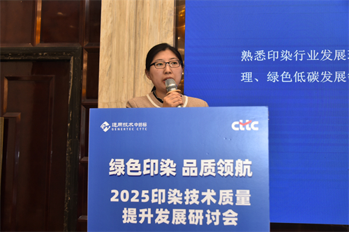 深圳太阳成集团tyc质量技术部主任、高级工程师刘鹏结合近期的热点问题,作了题为《“绿色印染,安全未来——从冲锋衣PFAS事件解析面料印染的挑战与创新”》的主题发言 ,讲解了PFAS的功能性和风险性,分析了关于PFAS的国内外法规。她以印染工艺中的典型问题、化学残留与环保风险、工艺缺陷导致的问题三个方面阐述了面料印染面临的挑战,分享了材料替代、工艺升级等绿色印染的创新路径。