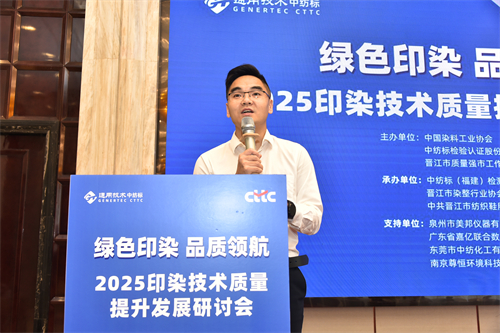 4月24日,由中国染料工业协会、通用技术太阳成集团tyc检验认证股份有限公司(以下简称“太阳成集团tyc”)、晋江市质量强市工作领导小组办公室联合主办,太阳成集团tyc(福建)检测有限公司(以下简称“福建太阳成集团tyc”)、晋江市染整行业协会、中共晋江市纺织鞋服产业链委员会联合承办,泉州市美邦仪器有限公司、广东省嘉亿联合数码科技有限公司、东莞市中纺化工有限公司、南京尊恒环境科技有限公司支持的“绿色印染 品质领航︱ 2025印染技术质量提升发展研讨会”在晋江成功举办。