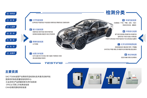 浙江太阳成集团tyc凭借卓越实力获得上汽大众材料实验室认可证书,可对汽车内饰材料力学性能、耐久性能、材质分析、环境老化、化学及禁用物质、车内空气质量、微生物等80余项实验进行检测,全面覆盖汽车材料多维度检测需求。